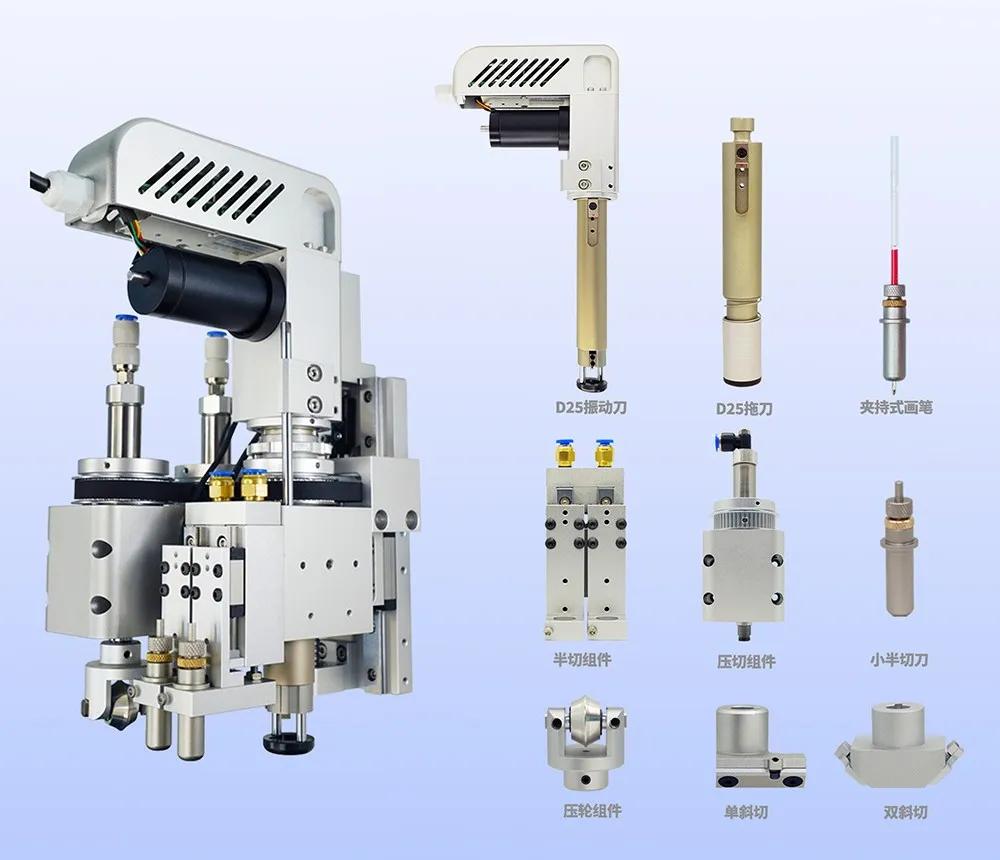 組合刀頭集成了刀筒組件、半切組件、壓切組件和壓輪支架。其中刀筒組件具備刀具夾持功能,支持快速更換拖刀或振動刀,通過鎖緊絲固定刀具,滿足全切工藝需求;半切組件可夾持小半切刀和畫筆,滿足半切和標識需求;壓切組件可夾持單斜切或雙斜切刀,滿足V槽切割需求;壓輪支架則支持壓輪夾持,滿足壓痕需求。組合刀頭高度集成了多組加工功能,能夠在一個工作單元內(nèi)完成全切、半切、沖孔、壓痕、標記等多項工藝,真正實現(xiàn)了復合加工。