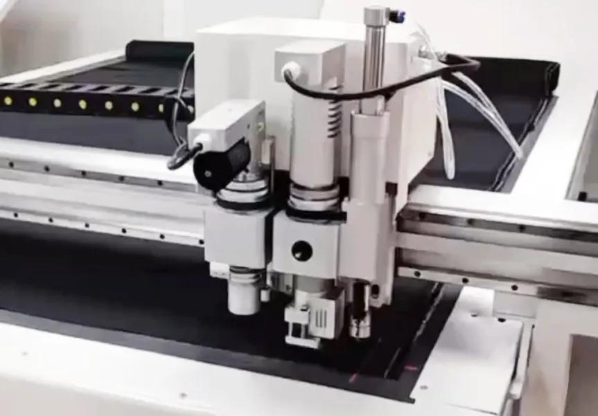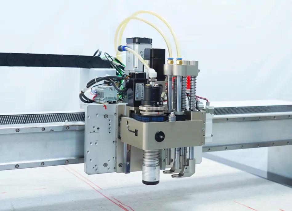 組合刀頭集成了刀筒組件、半切組件、壓切組件和壓輪支架。其中刀筒組件具備刀具夾持功能,支持快速更換拖刀或振動刀,通過鎖緊絲固定刀具,滿足全切工藝需求;半切組件可夾持小半切刀和畫筆,滿足半切和標識需求;壓切組件可夾持單斜切或雙斜切刀,滿足V槽切割需求;壓輪支架則支持壓輪夾持,滿足壓痕需求。組合刀頭高度集成了多組加工功能,能夠在一個工作單元內(nèi)完成全切、半切、沖孔、壓痕、標記等多項工藝,真正實現(xiàn)了復合加工。